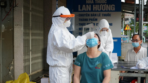 Lực lượng y tế lấy mẫu xét nghiệm sàng lọc SARS-CoV-2 cho người dân khu vực nguy cơ cao trên địa bàn TP. Buôn Ma Thuột.