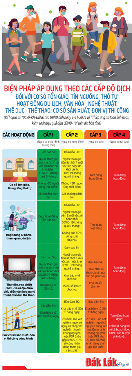 Dưới đây là các biện pháp áp dụng theo các cấp độ dịch đối với cơ sở tôn giáo, tín ngưỡng, thờ tự; hoạt động du lịch, văn hóa – nghệ thuật; thể dục – thể thao; cơ sở sản xuất, đơn vị thi công: