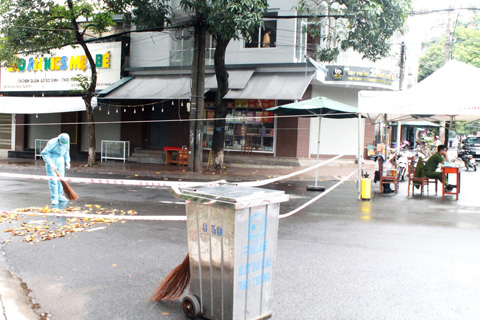 Lực lượng chức năng thực hiện vệ sinh môi trường ở một khu dân cư bị phong tỏa trên địa bàn TP. Buôn Ma Thuột.