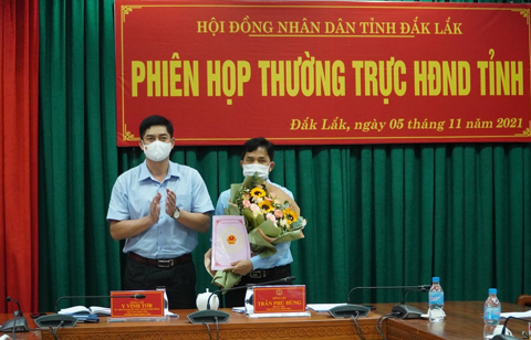 Chủ tịch HĐND tỉnh Y Vinh Tơr trao quyết định và tặng hoa chúc mừng đồng chí Nguyễn Xuân Đá.