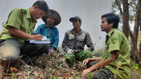 Cán bộ kiểm lâm Vườn Quốc gia Chư Yang Sin tuyên truyền, vận động các hộ dân sống gần rừng ký cam kết không gây cháy rừng. Ảnh: Vạn Tiếp