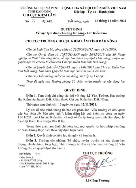 Chi cục Kiểm lâm tỉnh Đắk Nông cho biết, đã tạm đình chỉ công tác ông Lê Văn Tường, Hạt trưởng Hạt kiểm lâm huyện Đắk R’lấp để xác minh thông tin ông này có thói quen gác chân lên bàn làm việc. Thời hạn tạm đình chỉ 15 ngày.