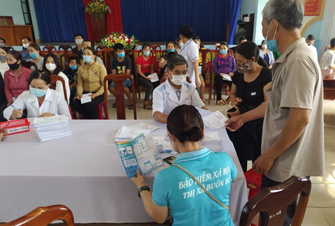 Cán bộ BHXH thị xã Buôn Hồ tuyên truyền chính sách hỗ trợ cho người lao động bị ảnh hưởng do dịch bệnh COVID-19 tại xã Ea Drông và Ea Siên.