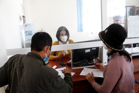 Cán bộ BHXH thị xã Buôn Hồ giải quyết hồ sơ nhận chế độ hỗ trợ cho vợ chồng chị Nguyễn Thị Thúy Oanh.