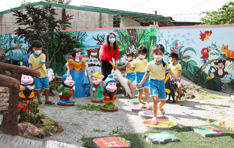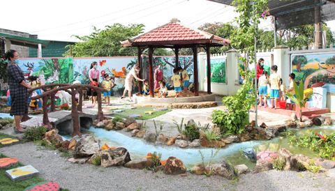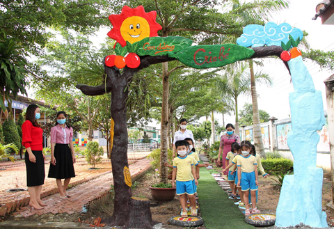 Sau khi được chọn làm điểm triển khai thực hiện Chuyên đề “Xây dựng trường mầm non lấy trẻ làm trung tâm giai đoạn 2016 - 2020”, Ban Giám hiệu nhà trường đã phối hợp với cha mẹ học sinh cải tạo, quy hoạch, bố trí tận dụng tất cả không gian trong và ngoài lớp nhằm tạo điều kiện cho trẻ được thỏa mãn nhu cầu học tập và khám phá, trải nghiệm. Nhà trường vận động phụ huynh, doanh nghiệp hỗ trợ kinh phí làm sân chơi. Đồng thời, ngoài giờ lên lớp, các cô giáo trồng hoa, rau xanh, sử dụng các vật liệu tái chế làm đồ chơi, lấy đá cuội tạo hình con vật, bông hoa.