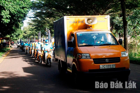 Cán bộ BHXH và Bưu điện tỉnh tuyên truyền lưu động trên các tuyến đường
