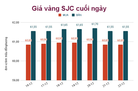 Trước đó, do từ 9 giờ đến 17 giờ ngày 22-12 giá vàng thế giới gần như bất động, sức mua yếu nên trong khoảng thời gian này, giá vàng SJC tại Việt Nam "giẫm chân tại chỗ" 61,55 triệu đồng/lượng, cao hơn giá vàng thế giới quy đổi 11,4 triệu đồng/lượng.