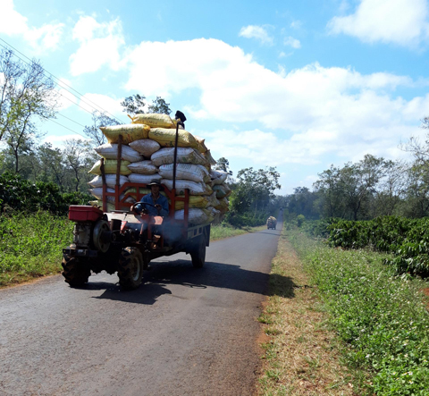 Những chiếc xe công nông nối đuôi nhau chở từng bao quả cà phê từ vườn, rẫy về nhà.