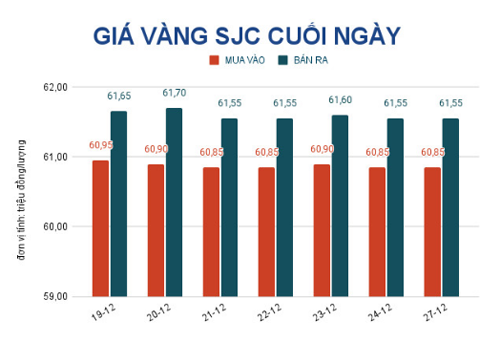 Trước đó, do từ 9 giờ đến 17 giờ ngày 27-12 giá vàng thế giới biến động không đáng kể, sức mua gần bằng không nên trong khoảng thời gian này, giá vàng SJC tại Việt Nam bất động tại 61,55 triệu đồng/lượng, cao hơn giá vàng thế giới quy đổi khoảng 11 triệu đồng/lượng.