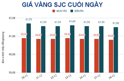 Trước đó, giá vàng SJC tại Việt Nam cũng giảm 50.000 đồng/lượng, chốt cuối ngày 28-12 tại 61,5 triệu đồng/lượng. Như thế, giá vàng trong nước cao hơn giá vàng thế giới quy đổi khoảng 11 triệu đồng/lượng.