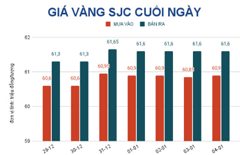 Trước đó, giá vàng SJC tại Việt Nam vào cuối ngày 4-1 cũng tăng 100.000 đồng/lượng, giao dịch tại 61,6 triệu đồng/lượng. Theo đó, giá vàng trong nước cao hơn giá vàng thế giới quy đổi khoảng 11,5 triệu đồng/lượng.