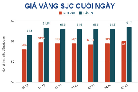 Trước đó, do từ 9 giờ đến 17 giờ ngày 5-1, giá vàng thế giới tăng không đáng kể nên giá vàng SJC tại Việt Nam vào cuối ngày chỉ tăng 50.000 đồng/lượng, giao dịch tại 61,7 triệu đồng/lượng. Như thế, giá vàng trong nước cao hơn giá vàng thế giới quy đổi hơn 11 triệu đồng/lượng.