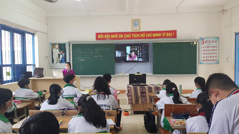 Giờ học môn Văn kết hợp dạy trực tiếp và trực tuyến tại Trường THCS Nguyễn Tất Thành.