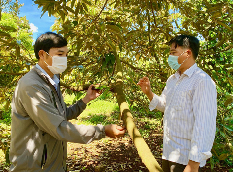 Ông Đặng Mằn Nàm (bên phải) giới thiệu vườn sầu riêng của gia đình với cán bộ Hội Nông dân xã Cư Suê.