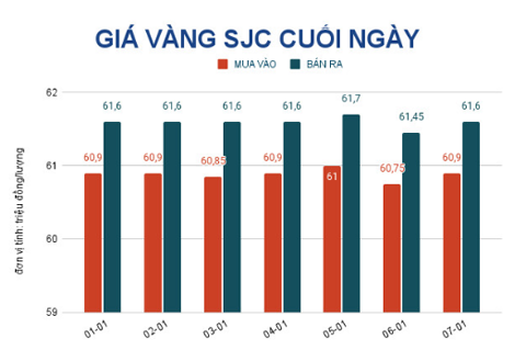 Trước đó, giá vàng SJC tại Việt Nam vào cuối ngày 7-1 cũng tăng 180.000 đồng/lượng, giao dịch tại mức 61,6 triệu đồng/lượng. Như thế, giá vàng trong nước cao hơn giá vàng thế giới quy đổi 12 triệu đồng/lượng.