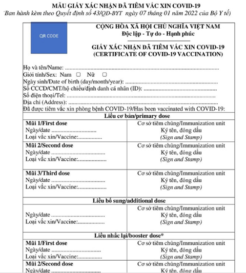 Theo đại diện Cục Y tế dự phòng, trên cơ sở cập nhật những thay đổi trong việc khuyến cáo tiêm liều bổ sung, liều nhắc lại trên thế giới, Bộ Y tế đã sửa đổi mẫu xác nhận tiêm chủng vắc-xin Covid-19. Giấy xác nhận này đảm bảo điền được các thông tin của lịch tiêm liều cơ bản, liều bổ sung và 1 mũi tiêm nhắc.