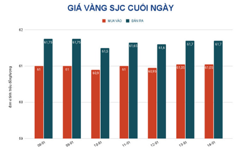 Trước đó, do sức mua yếu nên giá vàng SJC ngày 14-1 ở Việt Nam bất động tại 61,7 triệu đồng/lượng. Như thế, giá vàng trong nước cao hơn giá vàng thế giới quy đổi 11 triệu đồng/lượng.