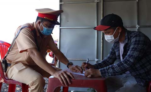 Cán bộ, chiến sĩ Đội CSGT-TT Công an huyện Krông Ana hướng dẫn người điều khiển xe máy kéo ký cam kết.