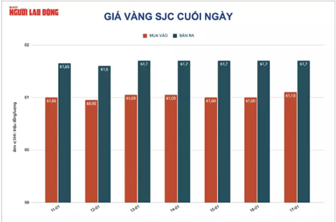 Trước đó, giá vàng SJC ngày 17-1 tại Việt Nam tăng 50.000 đồng/lượng, chốt cuối ngày tại 61,7 triệu đồng/lượng. Theo đó, giá vàng trong nước cao hơn giá vàng thế giới quy đổi hơn 11 triệu đồng/lượng.