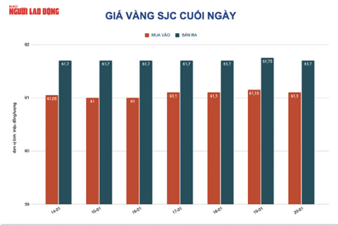 Trước đó, do từ 9 giờ đến 17 giờ ngày 20-1, giá vàng thế giới biến động không nhiều, cộng với sức mua yếu nên trong khoảng thời gian này, giá vàng SJC tại Việt Nam giảm 200.000 đồng/lượng, chốt cuối ngày tại 61,7 triệu đồng/lượng. Theo đó, giá vàng trong nước cao hơn giá vàng thế giới quy đổi khoảng 11 triệu đồng/lượng.