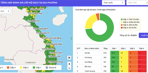 Cập nhật cấp độ dịch Covid-19 của Bộ Y tế đến sáng ngày 7-2 cho thấy cả nước không có tỉnh TP nào vùng đỏ (cấp độ dịch 4) hay vùng cam (cấp độ dịch 3), số địa phương vùng vàng (cấp độ dịch 2) còn 22 tỉnh, thành phố và vùng xanh (cấp độ dịch 1) đã là 41 tỉnh, thành phố.