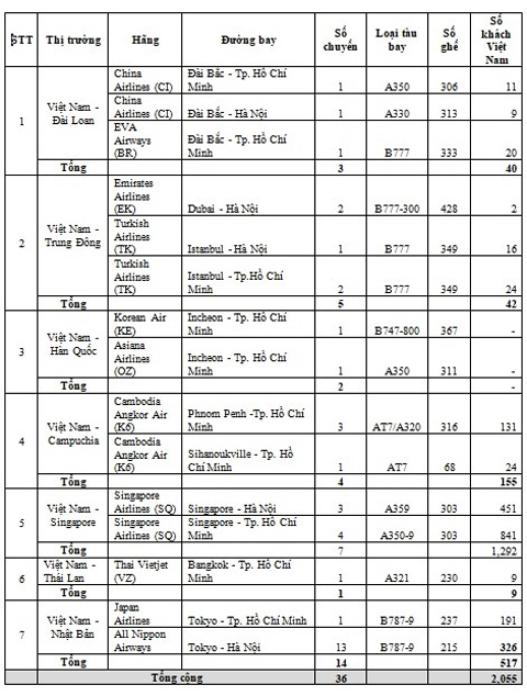 Số liệu chi tiết theo từng hãng hàng không, đường bay, số khách là người Việt Nam được thống kê từ ngày 31-1 đến ngày 7-2: