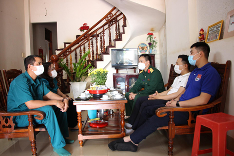 Thượng tá Mai Văn Khuê, Chính trị viên Ban Chỉ huy Quân sự thành phố đến thăm, chuyện trò cùng gia đình thanh niên Trương Thái Hoàn (áo trắng).