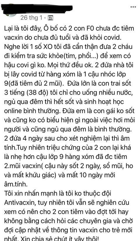 Trên các hội nhóm, diễn đàn mạng xã hội, nhiều phụ huynh cũng bày tỏ ý kiến lo lắng không muốn cho con tiêm vaccine phòng Covid-19 vì tác dụng phụ. Một số phụ huynh cho rằng, đọc nhiều thông tin trên mạng xã hội, nhiều nước trên thế giới còn e dè, thậm chí không tiêm vaccine cho độ tuổi này.