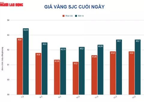 Sáng 14-2, giá vàng SJC tại TP HCM được các doanh nghiệp niêm yết mua vào 62,05 triệu đồng/lượng, bán ra 62,75 triệu đồng/lượng - tăng 250.000 đồng mỗi lượng so với hôm qua.