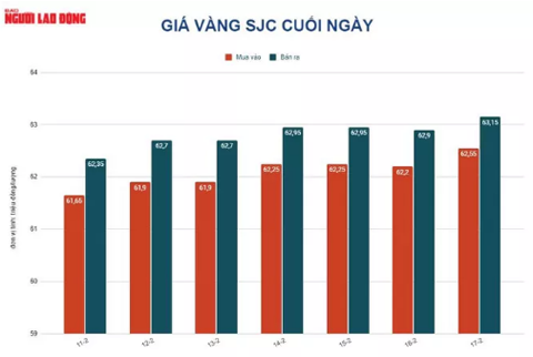 Tại Việt Nam, giá vàng SJC ngày 17-2 cũng tăng 100.000 đồng/lượng, chốt cuối ngày tại 63,15 triệu đồng lượng, cao hơn giá vàng thế giới gần 11 triệu đồng/lượng.