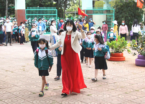 Giáo viên Trường Tiểu học Ngô Quyền (TP. Buôn Ma Thuột) dẫn học sinh khối 1 vào lớp.