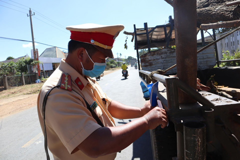 Cán bộ Đội CSGT - Trật tự (Công an huyện Krông Ana) dán phản quang cho xe máy kéo lưu thông trên Tỉnh lộ 2. (Ảnh minh họa)