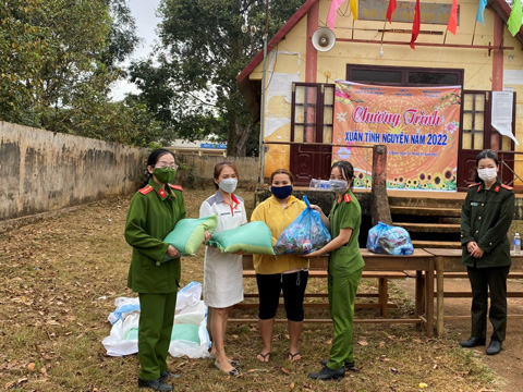 Nhân viên Hệ thống HEAD Lai Hương phối hợp với Công an huyện Cư Kuin trao quà tặng người dân có hoàn cảnh khó khăn.