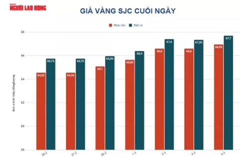 Trước đó tại Việt Nam, do sức mua tăng nên giá vàng SJC trong ngày 4-3 tăng 250.000 đồng/lượng, chốt cuối ngày tại 67,7 triệu đồng/lượng - mức giá cao nhất chưa từng có trong lịch sử thị trường vàng nước ta.