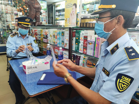 Lực lượng quản lý thị trường kiểm tra sản phẩm kit test bán tại một nhà thuốc trên địa bàn TP. Buôn Ma Thuột.