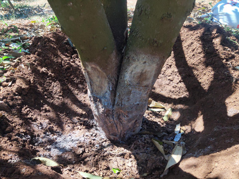 Một gốc sầu riêng bị nấm Phytophthora palmivora gây thối rễ.