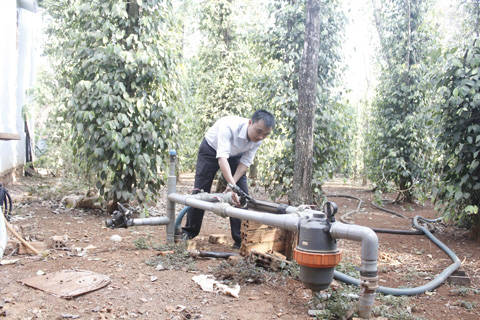 Để giải “bài toán” thiếu nước tưới cho cây trồng trong mùa khô, năm 2019 gia đình anh Nguyễn Ngọc Hoanh (thôn Ea Klang, xã Ea Sin) đã quyết định đào hồ chứa 10.000 m3 ngay trong rẫy. Hồ để thu nước trong mùa mưa (vừa giúp cây trồng tránh ngập úng), đồng thời trữ nước để tưới cho toàn bộ 4 ha cây trồng của gia đình vào mùa khô. Ban đầu, do sử dụng béc phun tự động nên chỉ tưới được một đợt là hết nước. Năm 2020, anh đã lắp đặt toàn bộ hệ thống tưới nhỏ giọt đến từng gốc cây trong vườn. Tuy tốn kém chi phí đầu tư ban đầu nhưng hiệu quả lâu dài, giúp đất luôn giữ được độ ẩm để cây phát triển tốt, đạt năng suất cao mà lại đỡ công lao động kéo ống, chuyển béc… Ngoài ra, việc bón phân cho cây cũng khá thuận tiện, chỉ cần bật cầu dao điện hệ thống dẫn tự động tưới đến từng gốc. Vì vậy, hai năm nay, gia đình anh Hoanh không còn lo thiếu nước tưới vào mùa khô nữa.