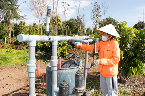 Chị Thi vận hành hệ thống tưới nhỏ giọt cho vườn ớt.