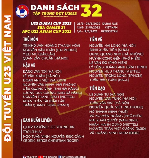 Danh sách 32 cầu thủ được triệu tập lên tuyển U23 Việt Nam chuẩn bị cho Dubai Cup 2022