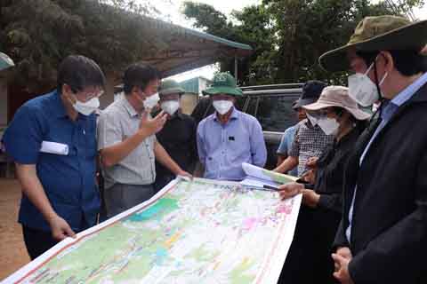 Đoàn công tác của Ban Chỉ đạo 321 do Bí thư Tỉnh ủy Nguyễn Đình Trung làm Trưởng đoàn xem bản đồ hướng tuyến cao tốc Khánh Hòa - Buôn Ma Thuột đoạn qua xã Cư Elang (huyện Ea Kar).