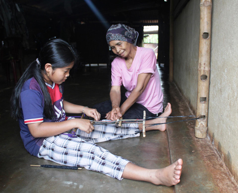 Em H’Trúc Niê (học sinh lớp 5B, Trường Tiểu học Nguyễn Công Trứ) được bà hướng dẫn cách dệt vải