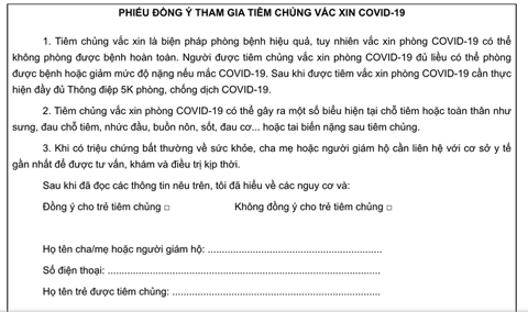 Bộ Y tế cũng đề nghị cha mẹ, người giám hộ thực hiện ký Phiếu đồng ý tiêm chủng theo mẫu ban hành; điểm tiêm chủng thực hiện khám sàng lọc trước tiêm theo hướng dẫn và theo dõi, chăm sóc sau tiêm theo quy định.