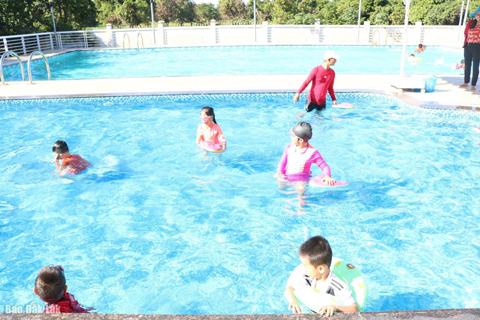 Các em học sinh Trường Tiểu học và THCS Nguyễn Khuyến (TP. Buôn Ma Thuột) đang học bơi. Ảnh: Hồ Lam