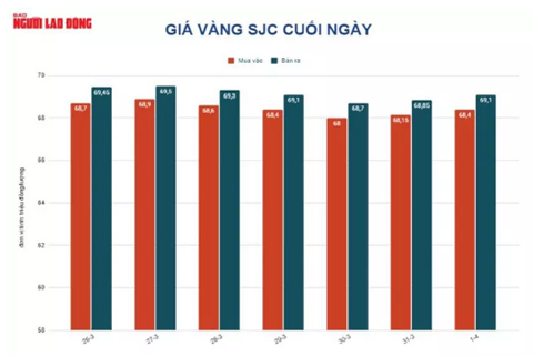 Trước đó, từ 9 giờ đến 17 giờ ngày 1-4, do giá vàng thế giới biến động không đáng kể, sức mua trong nước gần bằng không nên trong khoảng thời gian này, giá vàng SJC chỉ giảm 50.000 đồng/lượng, chốt cuối ngày 69,1 triệu đồng/lượng.