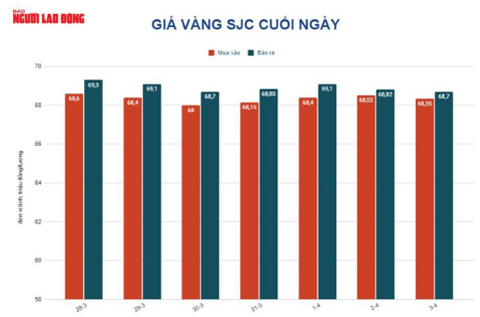 Mở cửa giao dịch ngày 4-4, các doanh nghiệp đồng loạt niêm yết giá vàng hôm nay mua vào 68,25 triệu đồng/lượng, bán ra 68,95 triệu đồng/lượng, tăng 100.000 đồng/lượng so với hôm qua.