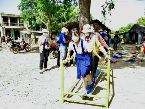 Hơn một tháng nay, khoảng sân đất của phân hiệu Trường Tiểu học Bùi Thị Xuân (thôn Đại Thành, xã Ea M’droh, huyện Cư M’gar) được trang trí bằng nhiều trò chơi với sắc màu rực rỡ, thu hút nhiều học sinh đến chơi đùa, trải nghiệm. Say sưa bên những trò chơi mới, em Đỗ Trung Kiên (lớp 4B, Trường Tiểu học Bùi Thị Xuân) hào hứng chia sẻ: “Trước đây, không có sân chơi, ngoài giờ học em và các bạn theo cha mẹ đi lên nương rẫy, hoặc đuổi bắt trên đồng cỏ. Bây giờ, trường em đã có sân chơi với nhiều trò chơi, em rất thích”.