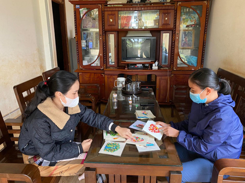 Chị Lệ (bên trái) giới thiệu các mẫu thiệp với cán bộ Hội LHPN xã Cư Mốt.