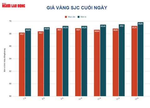 Trước đó, do từ 9 giờ đến 17 giờ ngày 13-4, giá vàng thế giới biến động không nhiều, cộng với sức mua yếu trong nước nên giá vàng SJC gần như bất động tại mức 69,85 triệu đồng/lượng.