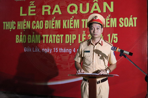 Trung tá Ngô Hoài Nam, Phó Trưởng Phòng CSGT, Công an tỉnh phát biểu, giao nhiệm vụ trong buổi lễ ra quân