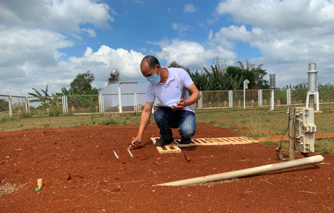 Anh Nguyễn Công Chính thực hiện quan trắc nhiệt độ mặt đất tại Trạm Khí tượng Buôn Ma Thuột.
